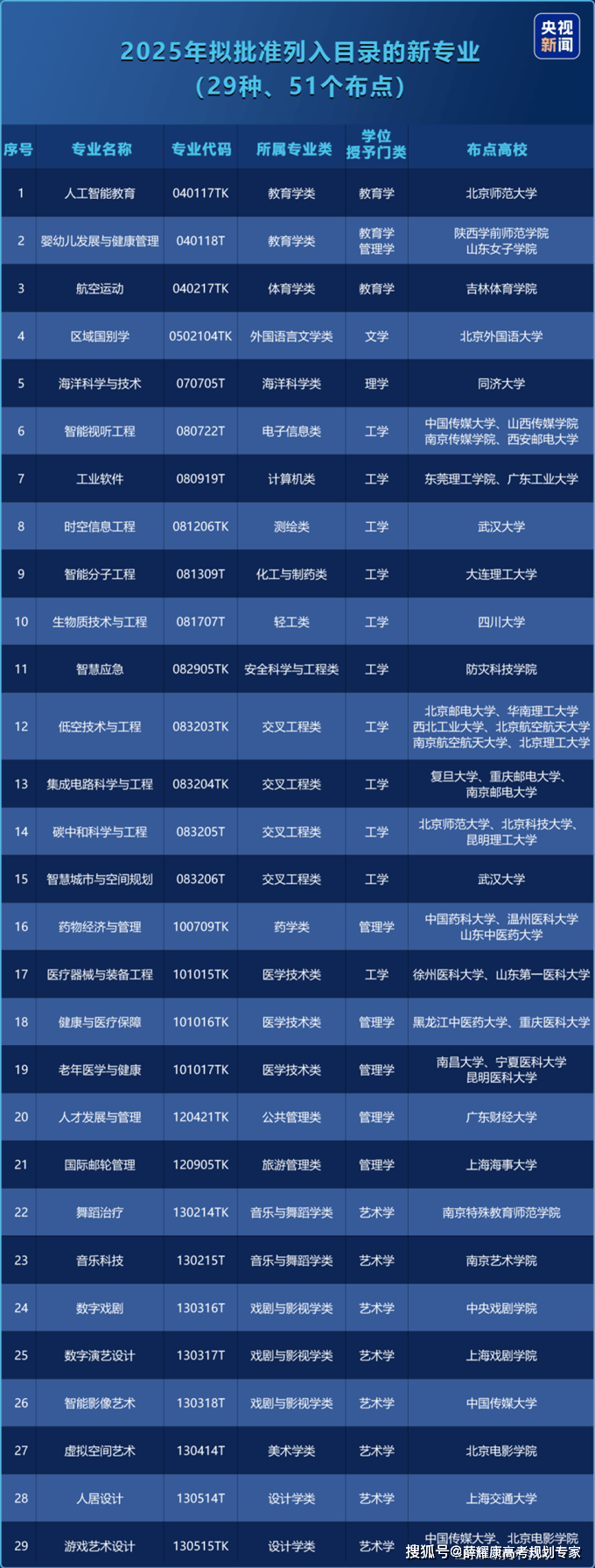 本年,教育部发布2024年度通俗高档学校本科专业存案和审批成果,并同步更新发布《通俗高档学校本科专业目次(2025年)》。为更快响应国度计谋,初次成立了计谋急需专业超凡设置机制,对于地方最新摆设、高度关心的计谋范畴,斥地相关专业设置立即响应“绿色通道”。增设的29种新专业,充实表现国度计谋、市场需乞降科技成长牵引。