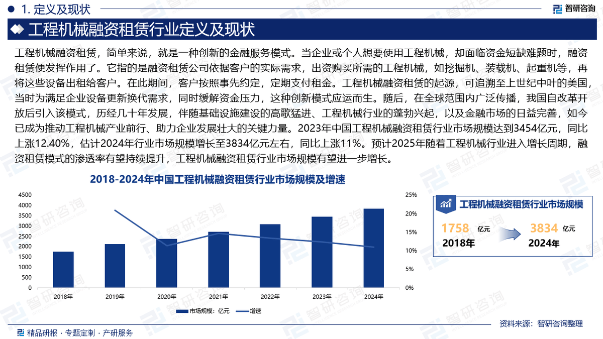 工程机械融资租赁的发源,可逃溯至上世纪中叶的美国,其时为满脚企业设备更新换代需求,同时缓解资金压力,这种立异模式应运而生。随后,正在全球范畴内普遍,我国自后引入该模式,历经几十年成长,工程机械行业的兴旺兴起,以及金融市场的日益完美,现在已成为鞭策工程机械财产前行、帮力企业成长强大的环节力量。2023年中国工程机械融资租赁行业市场规模达到3454亿元,同比上涨12。40%,估量2024年行业市场规模增加至3834亿元摆布,同比上涨11%。估计2025年跟着工程机械行业进入增加周期,融资租赁模式的渗入率无望持续提拔,工程机械融资租赁行业市场规模无望进一步增加。